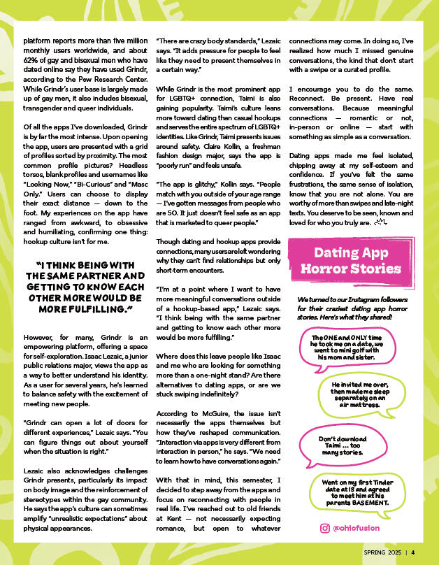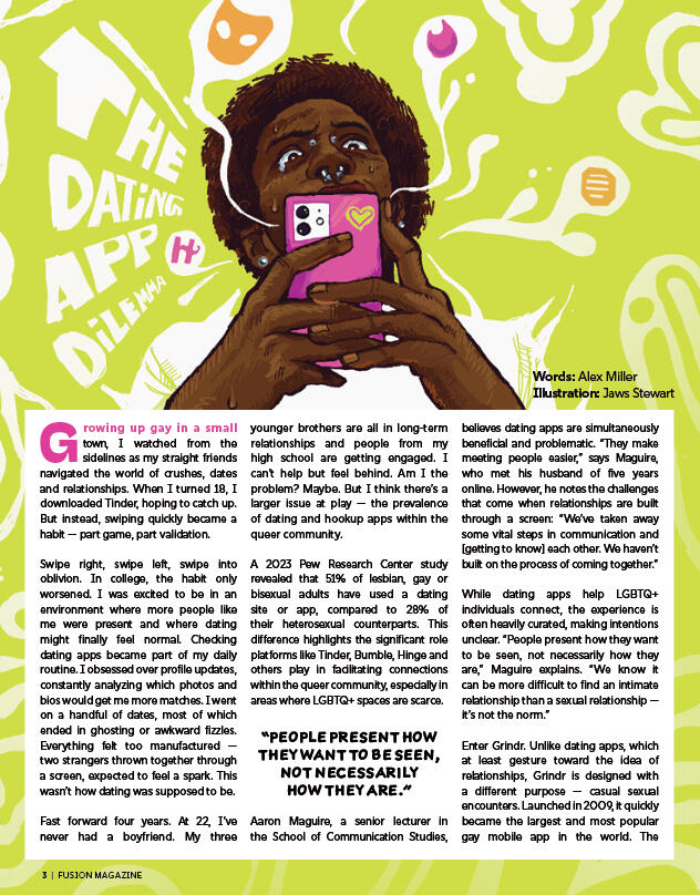 I was given the honor of illustrating Alex Miller's article “The Dating App Dilemma” in the Spring 2025 issue of Fusion Magazine. I was able to work within the style guide in regards to typography and color palette, but still was given tons of creative freedom on the exact illustration. I wanted to do this with an intense green/pink color palette from the style guide with ghost apps floating around the page to represent the disorienting reality of dating apps. The ghost patterns are very abstract and off the page.